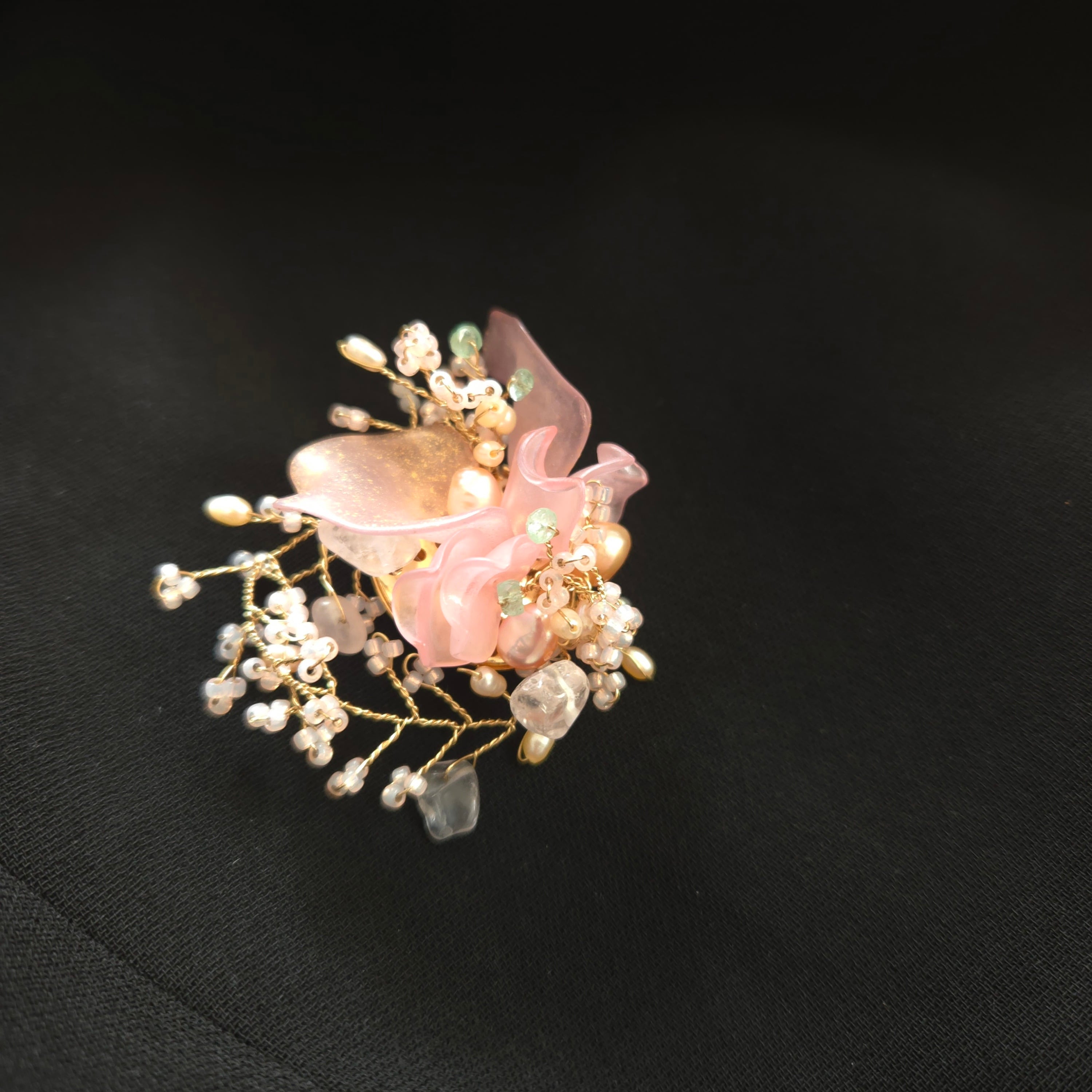 garden【大輪の華】~太陽と八重桜のブローチ~エメラルド・淡水パール・ローズクオーツ使用