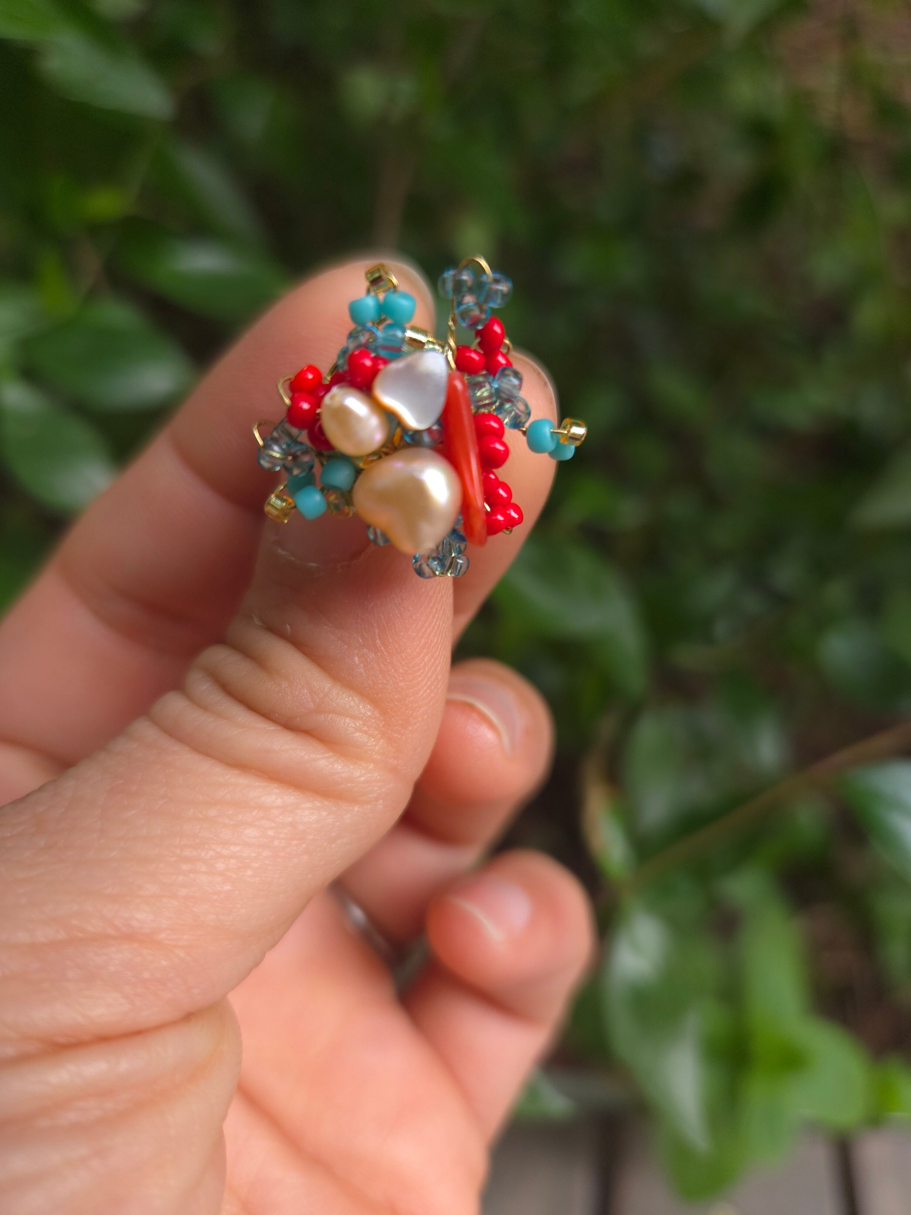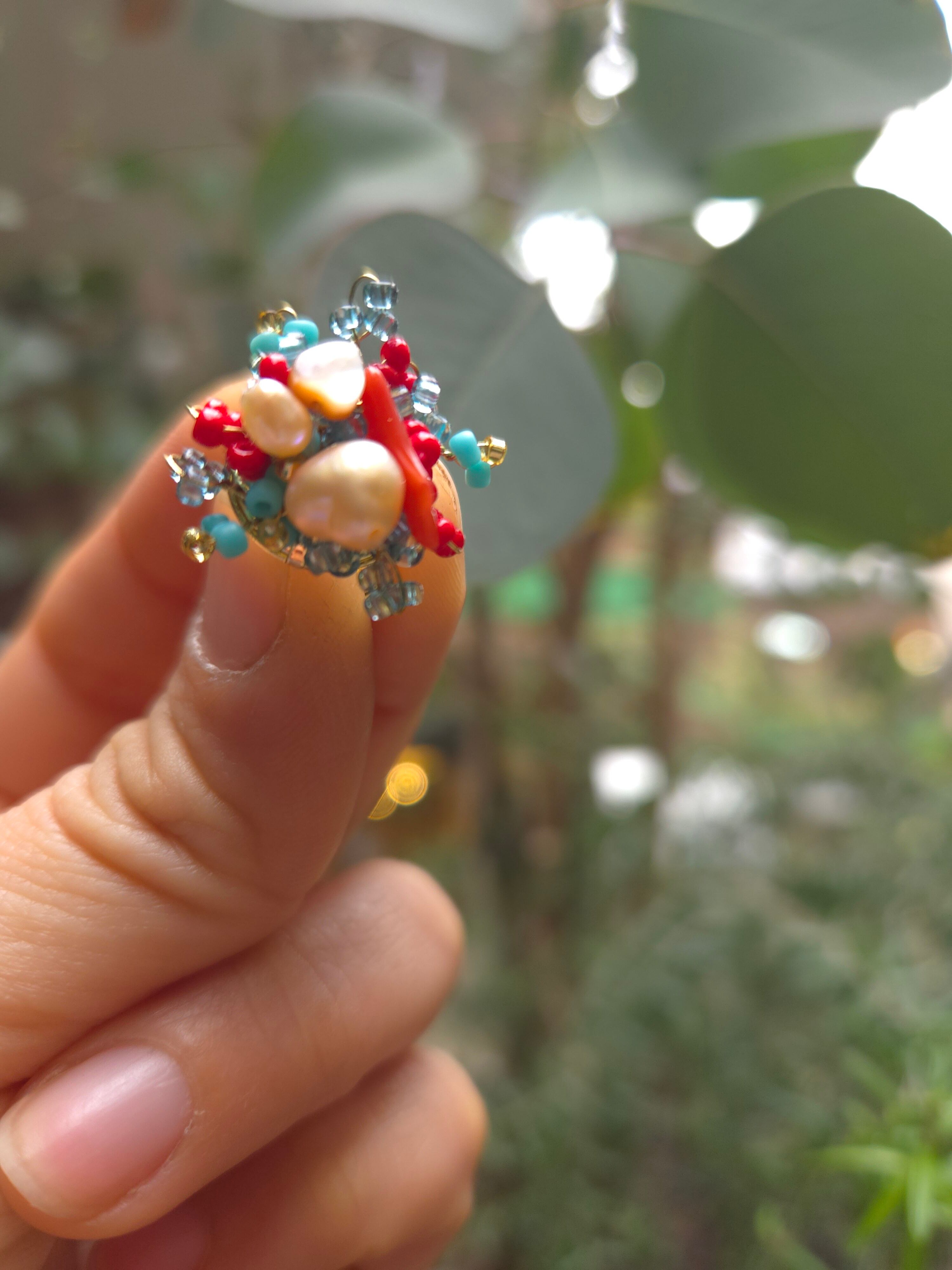 ブルーアパタイト、コーラル、淡水パール、シェルを使用。