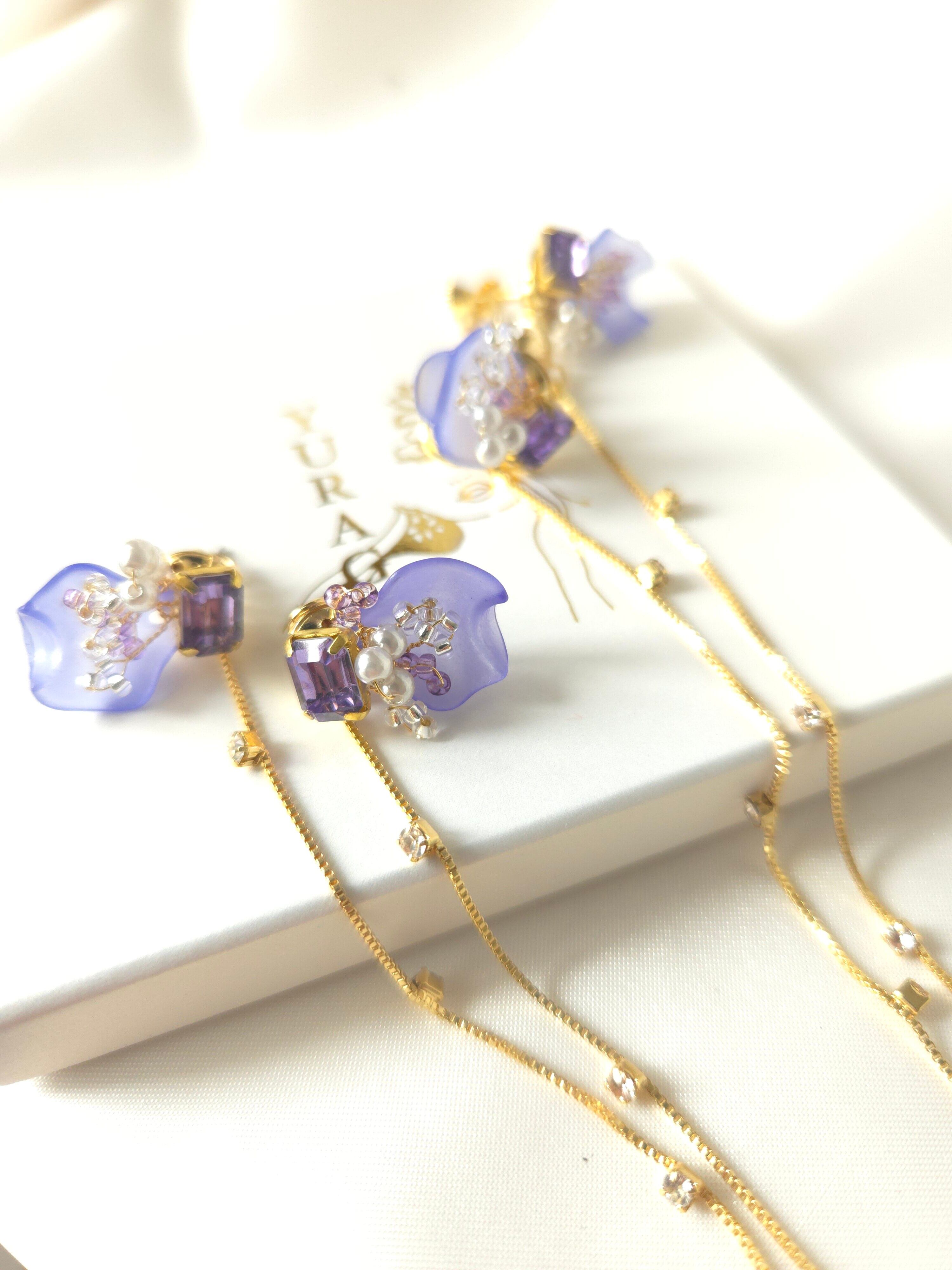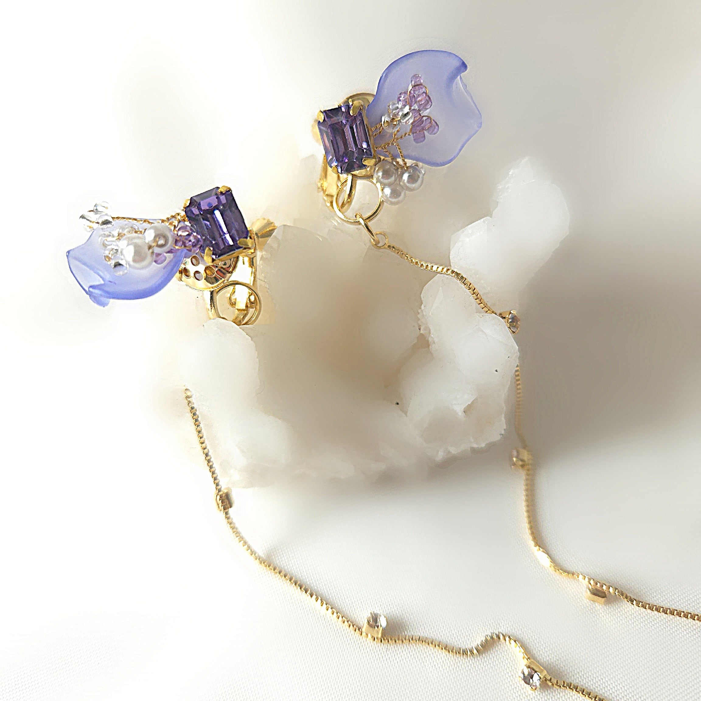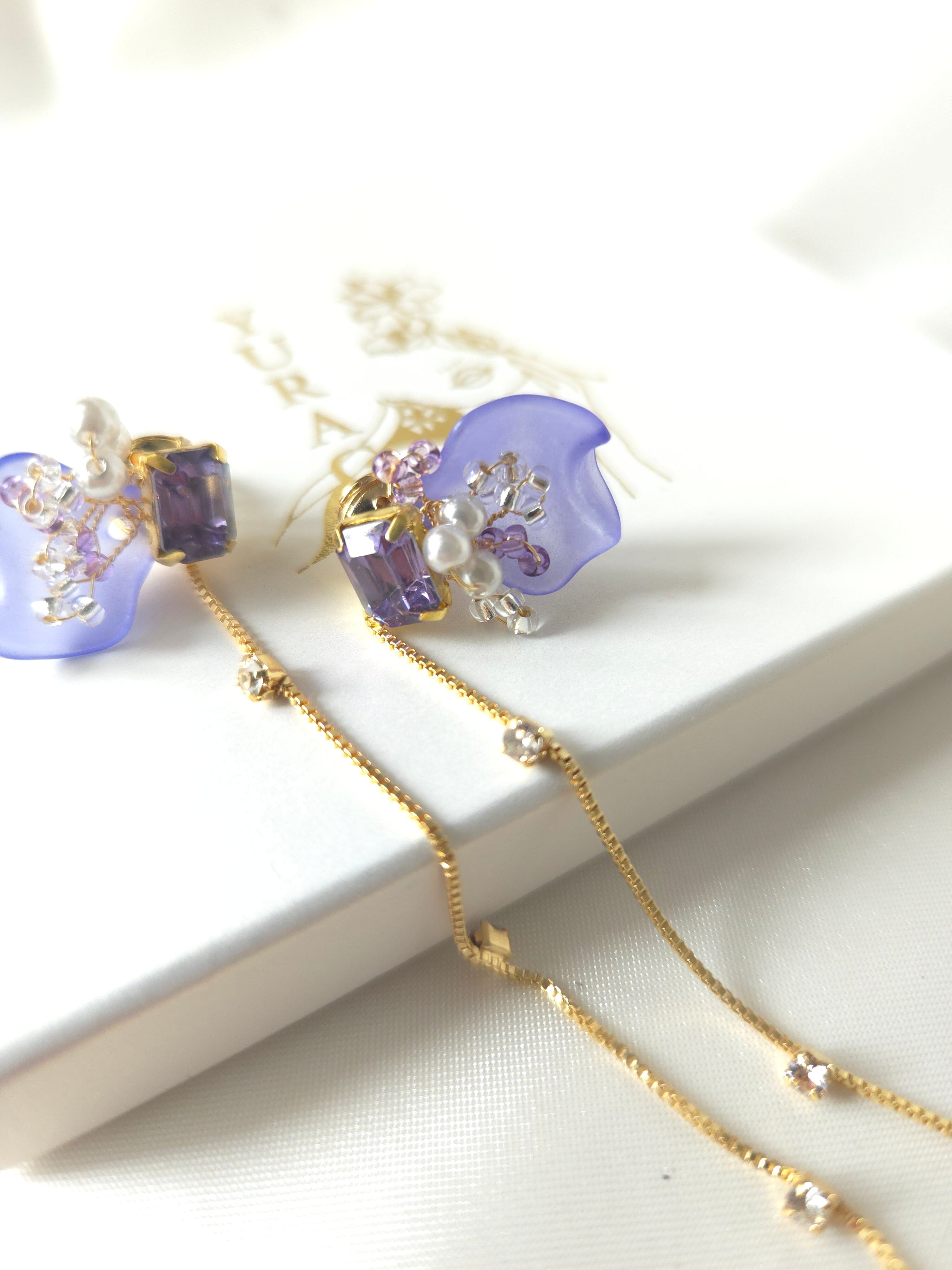 透き通るような淡いバイオレットのビジューが顔周りにあることで、お肌の透明感をアップしてくれますよ!