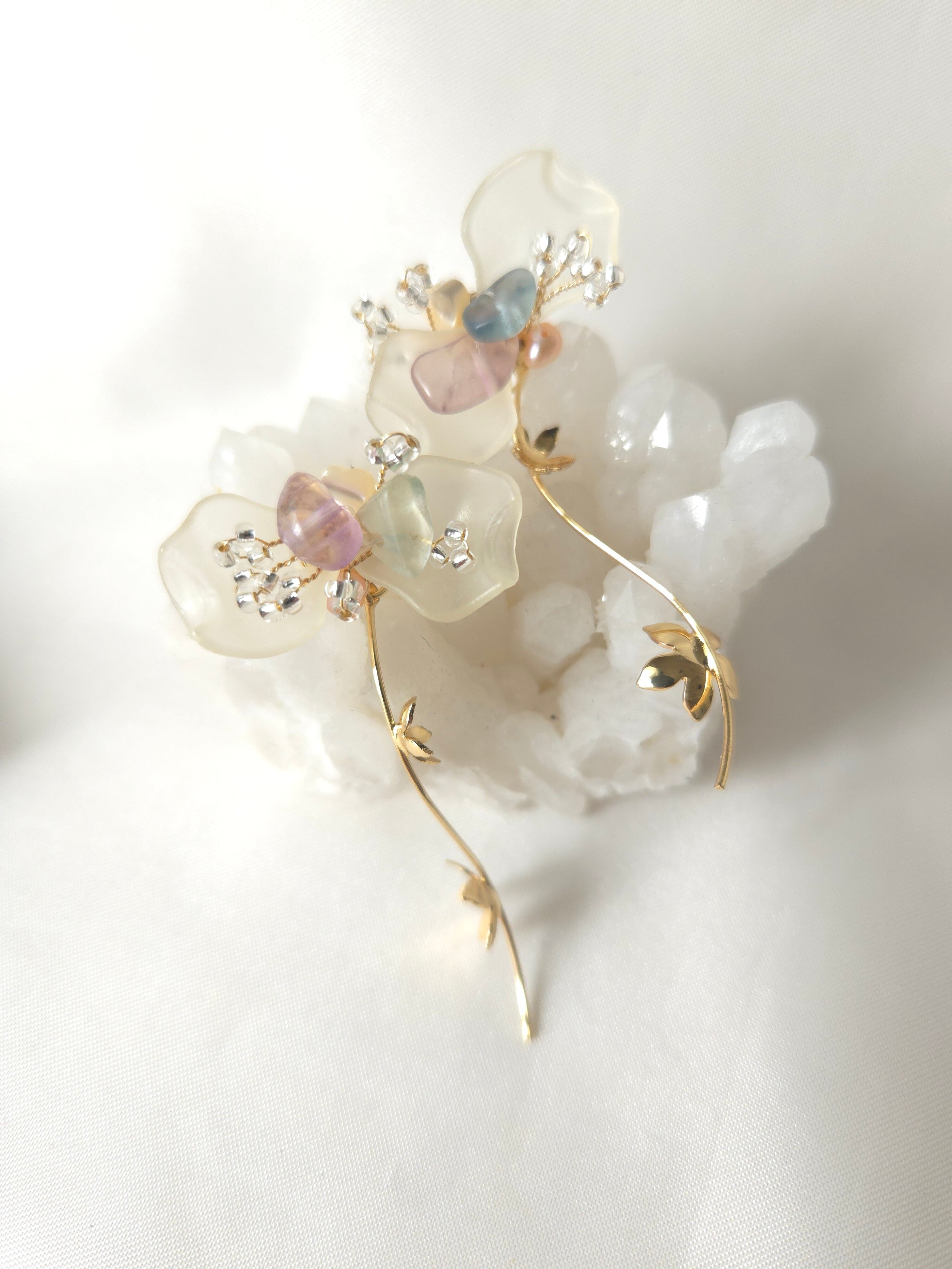 gardenシリーズは、自然の景色や植物をはじめ、日常の風景や目に見えない気持ち・・を私の感性のままに、ギュッと凝縮して、天然石やビーズをワイヤーで編み込み、アクセサリーにしています。