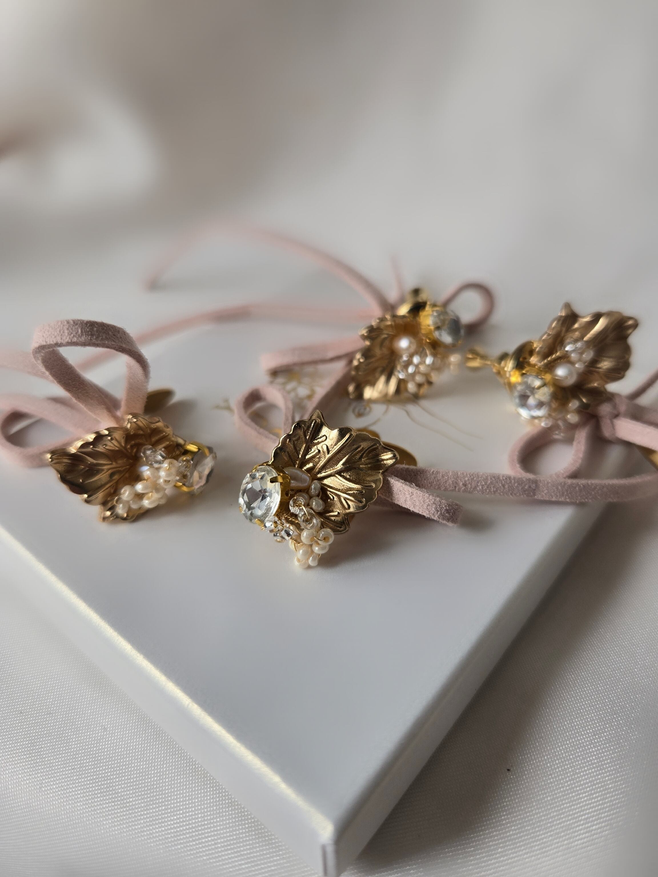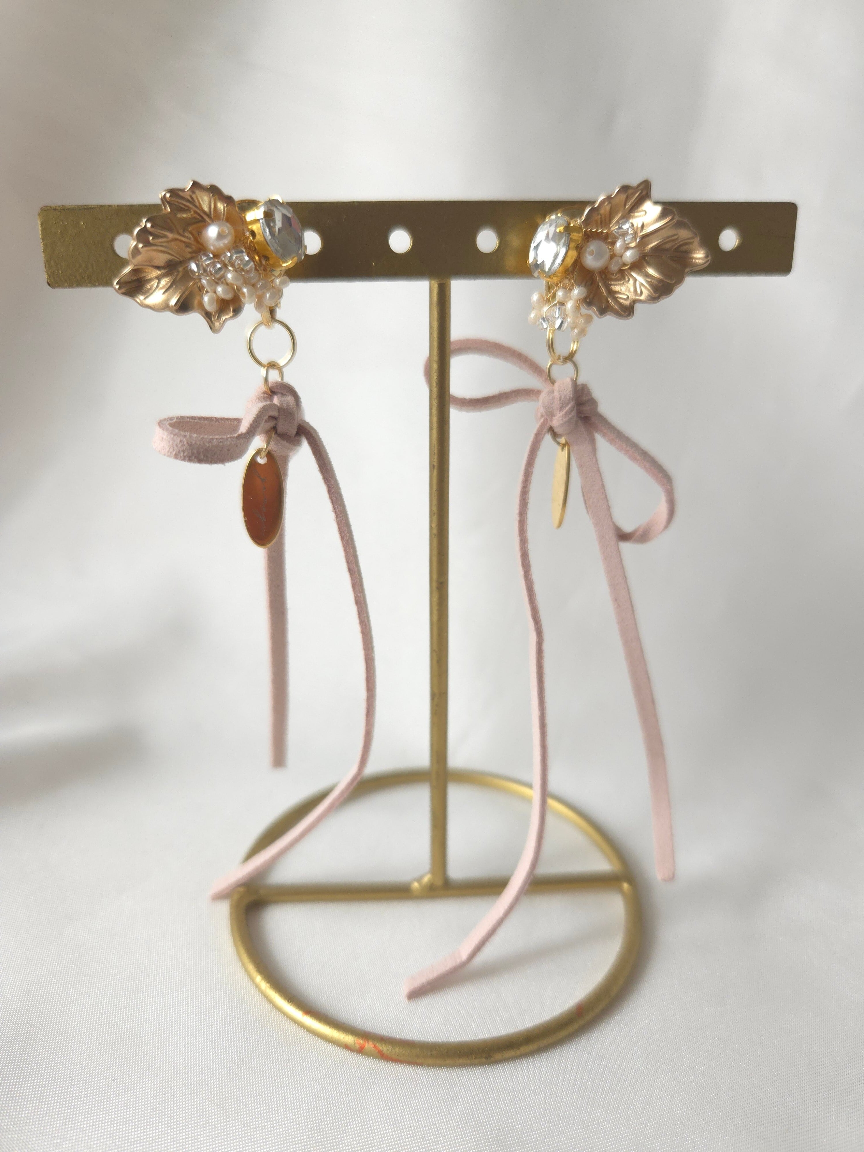 葉っぱのモチーフと、こっくりとしたクリームホワイトの小さなビーズを用いて、実りの秋をイメージし、制作させていただきました。