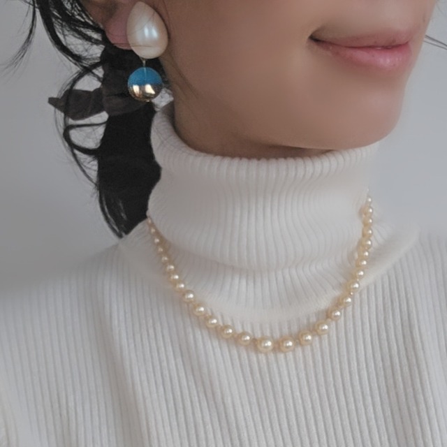 (淡水パールのネックレスよりも軽いつけ心地です。)