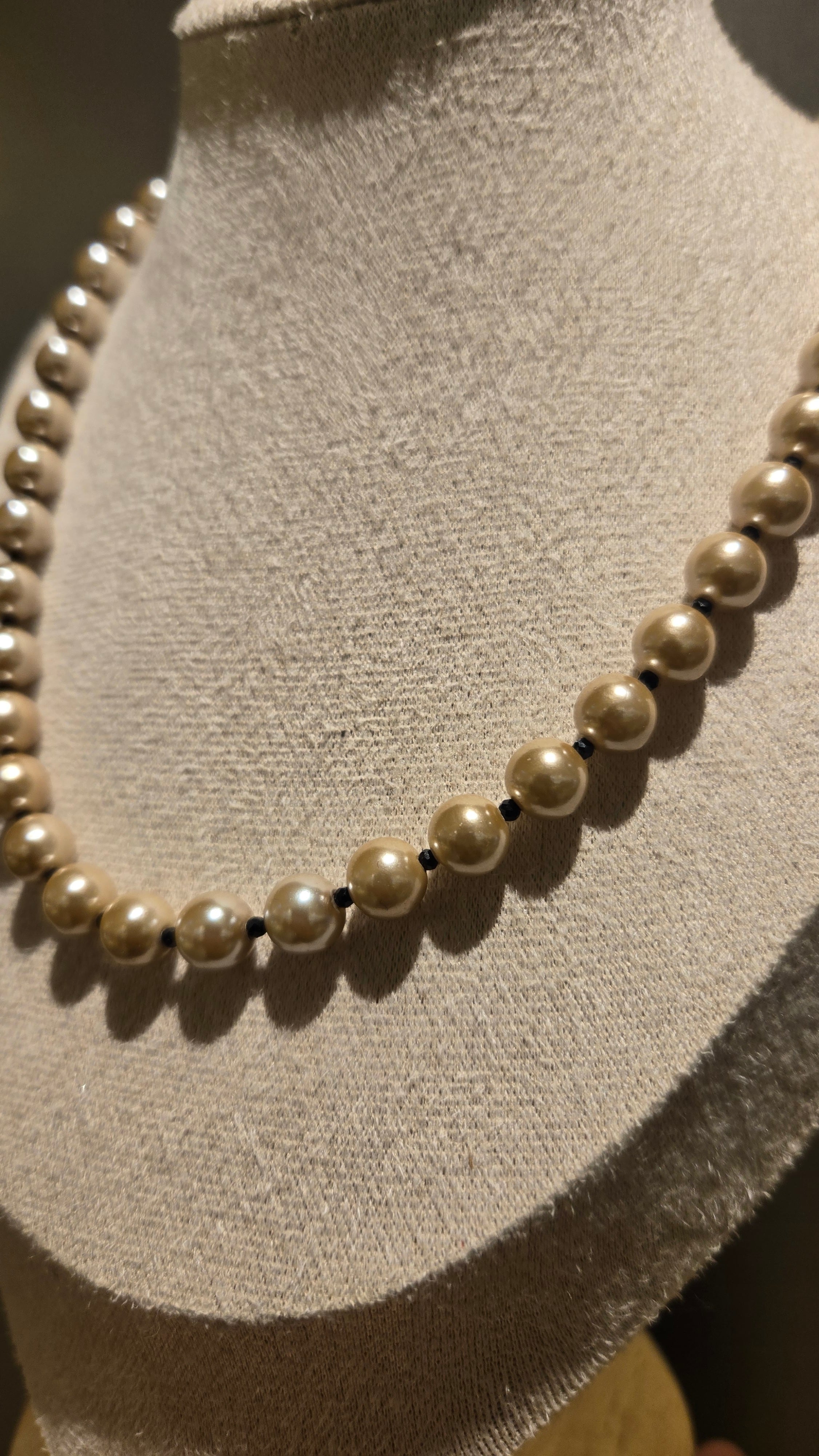 こちらの作品には日本のヴィンテージのシャンパンゴールド系のパール調ビーズ、天然石オニキスで制作させていただいています。