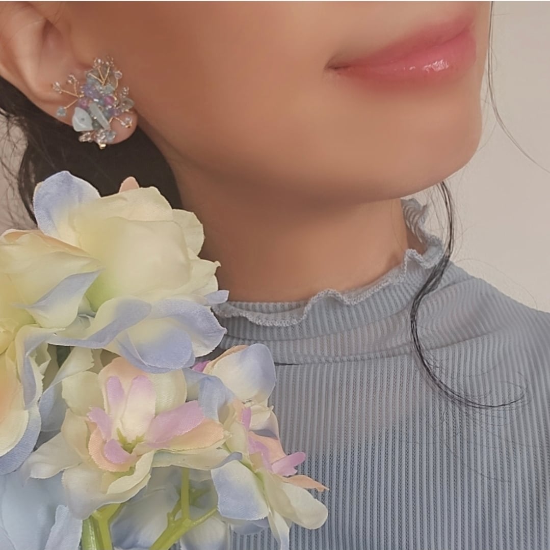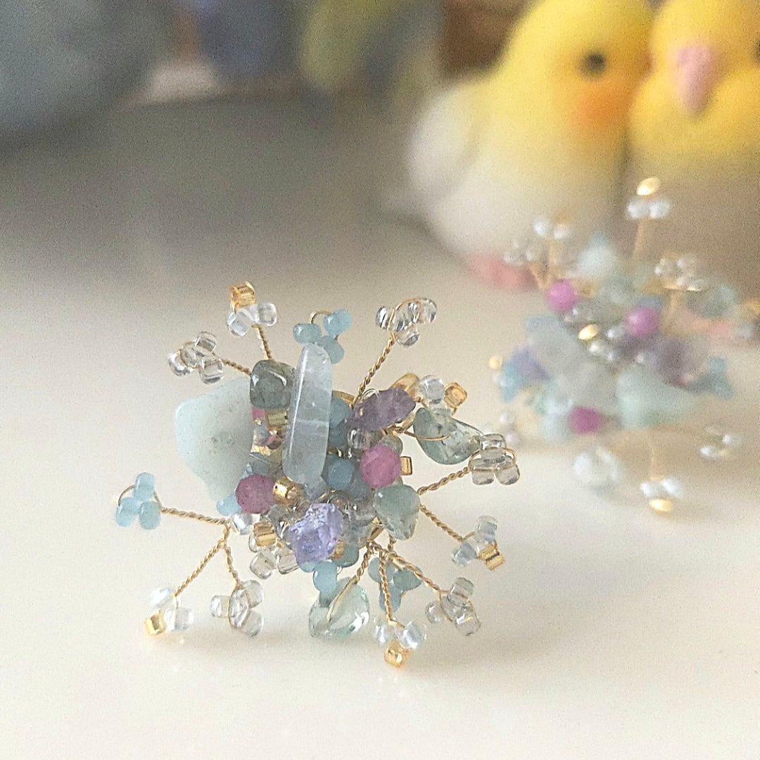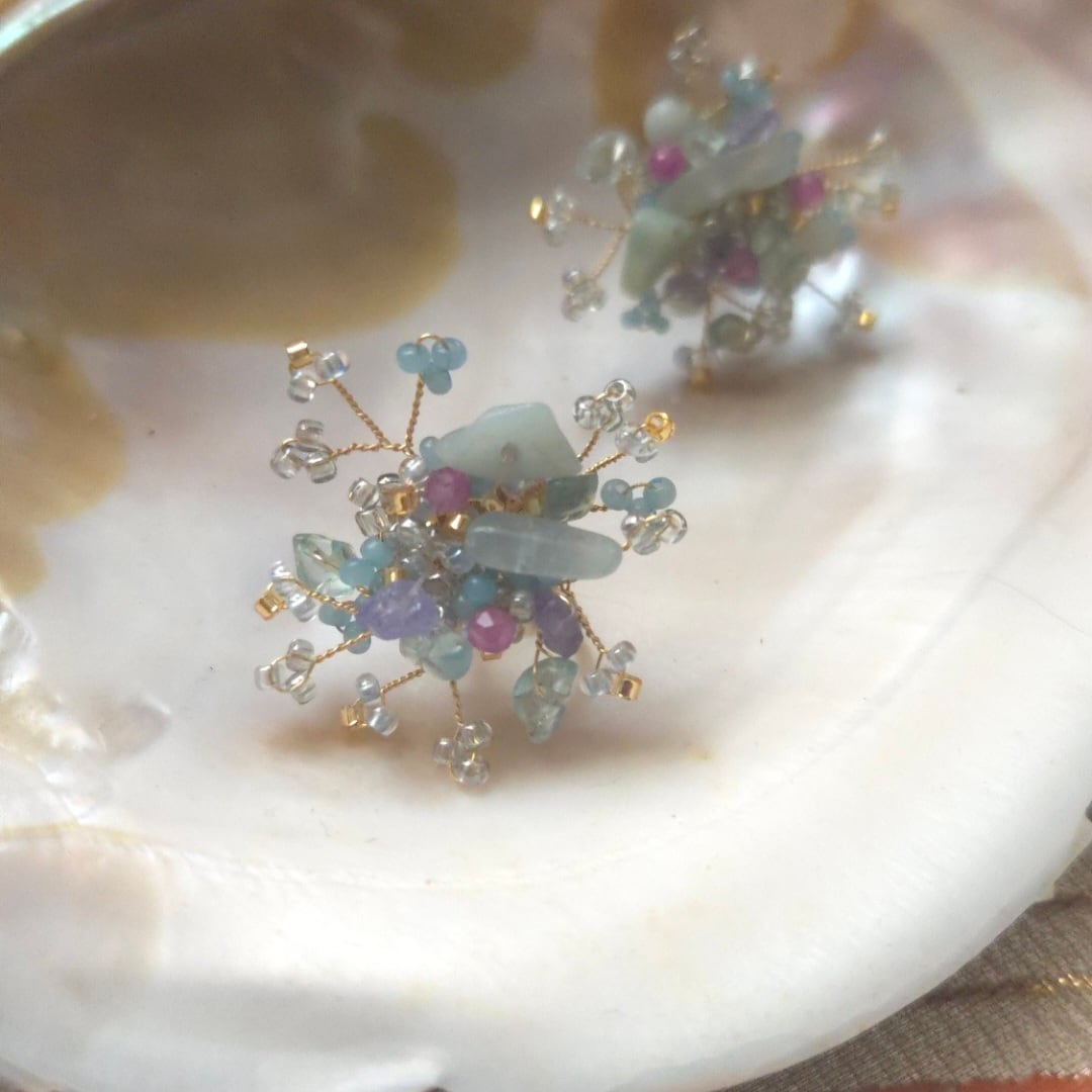 gardenシリーズは、自然の景色や植物をはじめ、日常の風景や目に見えない気持ち・・を私の感性のままに、ギュッと凝縮して、天然石やビーズをワイヤーで編み込み、アクセサリーにしています。