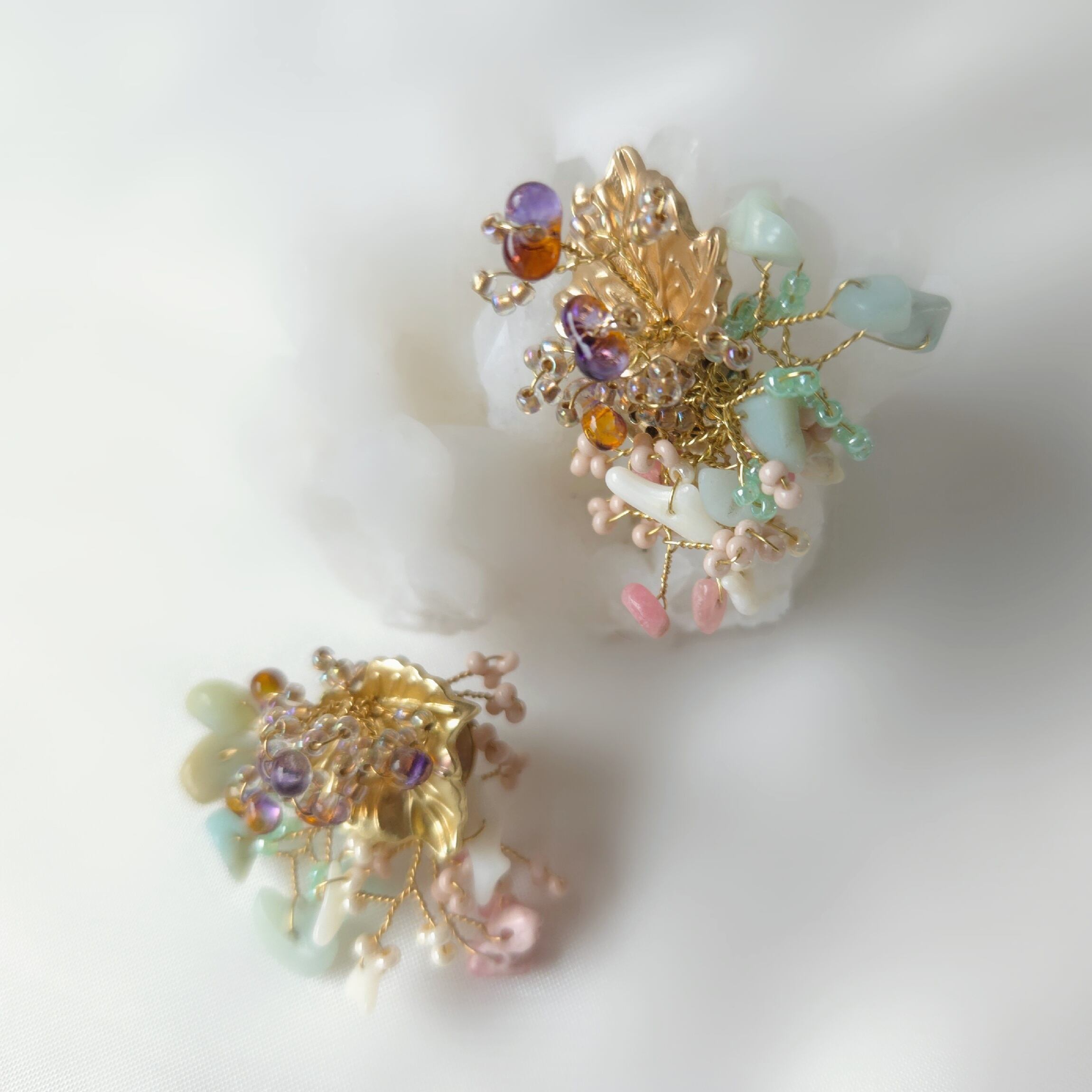 botanicalシリーズは、真鍮製の植物モチーフのパーツと、ビーズや天然石を編みこんで製作したパーツを組み合わせたアクセサリーです⚘華やかさがチャームポイント⚘